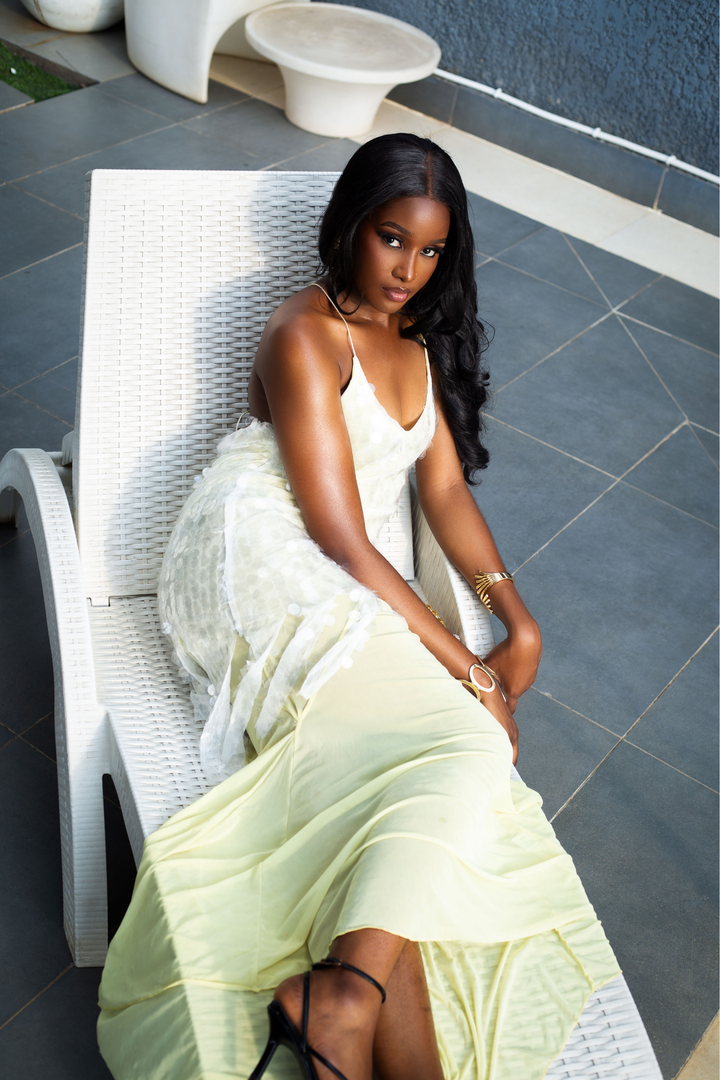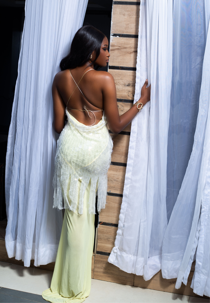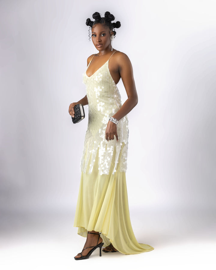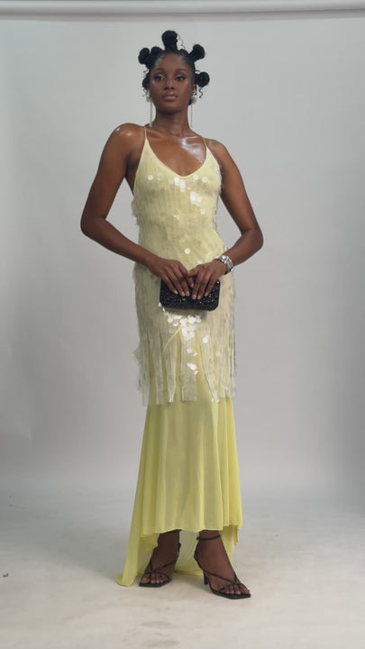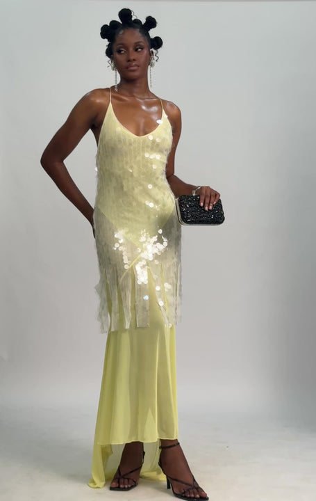 This elegant maxi dress features a fitted bodice adorned with sparkling sequin embellishments, transitioning into a flowing, sheer mesh skirt in a delicate yellow hue. The design includes a halterneck with cross-over spaghetti straps and an open back, creating a sophisticated and glamorous silhouette perfect for special occasions. The fitted waistline and full-length skirt offer a graceful and flattering fit.