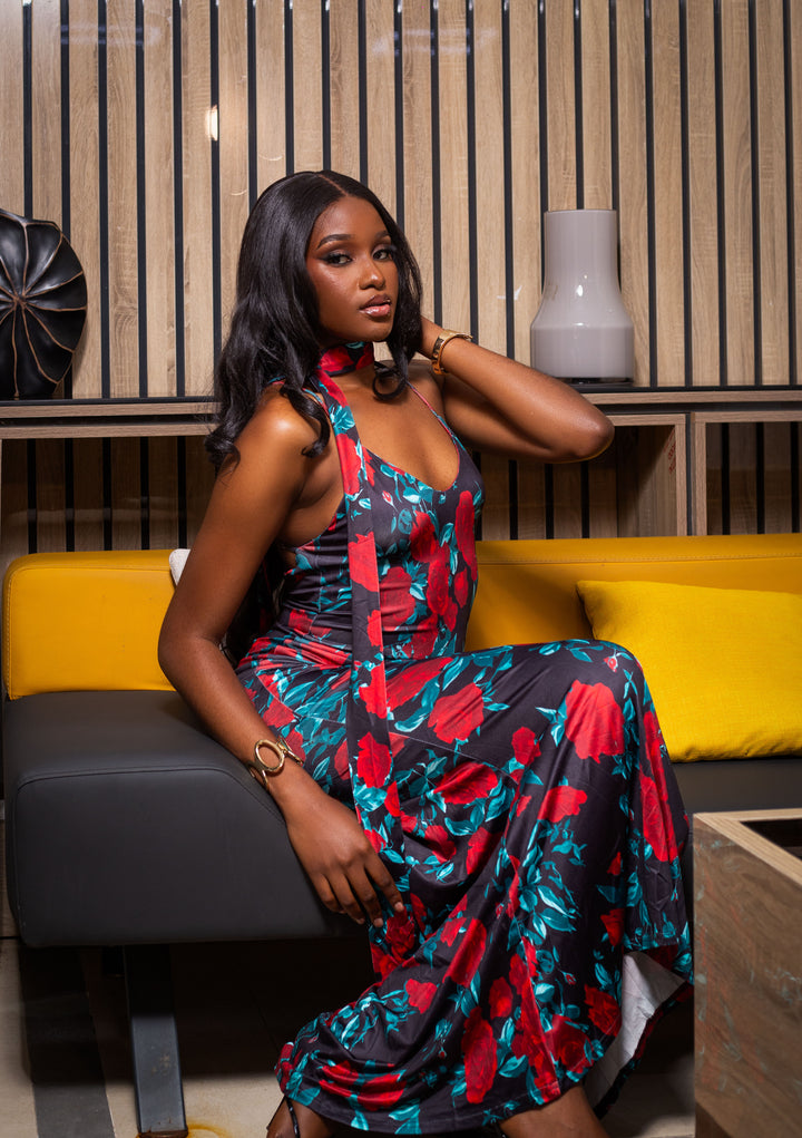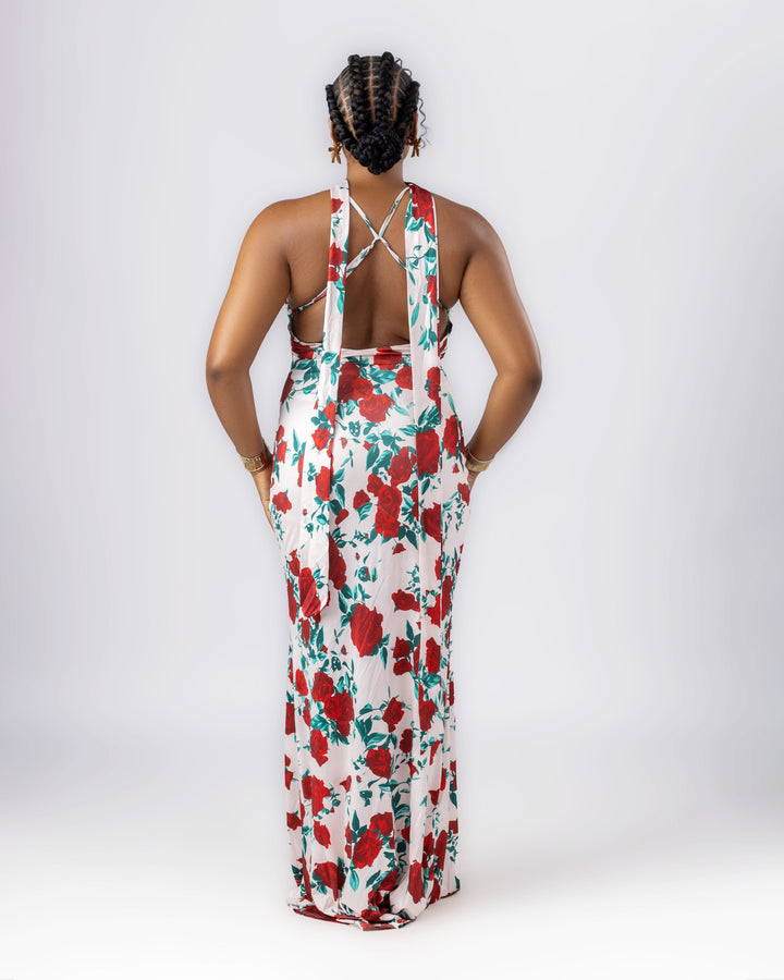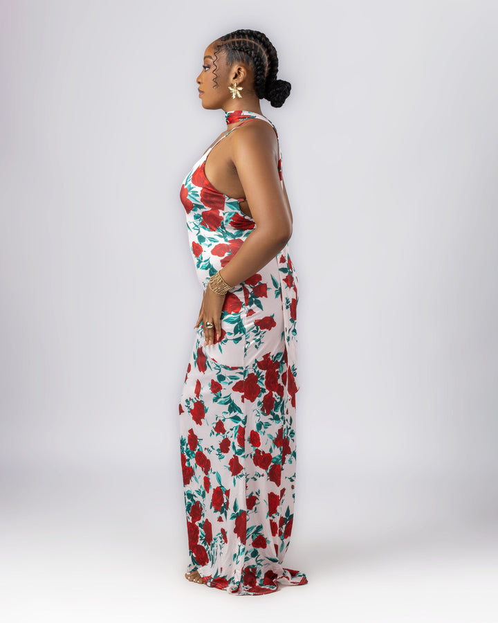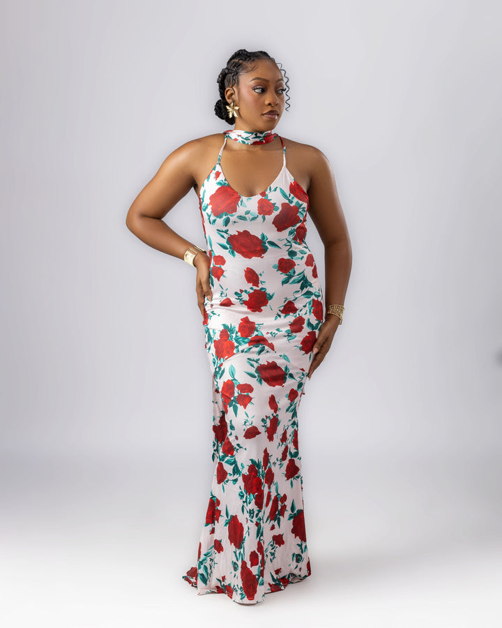 Turn heads in the Rose Garden Halter Gown, a stunning piece that blends timeless elegance with modern flair. This full-length dress features a delicate halter neckline that transitions into a chic choker-style collar, highlighting your shoulders and décolletage. The form-fitting silhouette gracefully hugs your curves before flaring out into a subtle mermaid hem, creating a flattering and sophisticated shape. Adorned with a vibrant red rose and green leaf print on a soft, light background, this gown is perfect for a special event, a romantic dinner, or any occasion where you want to make a memorable statement.