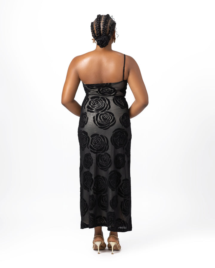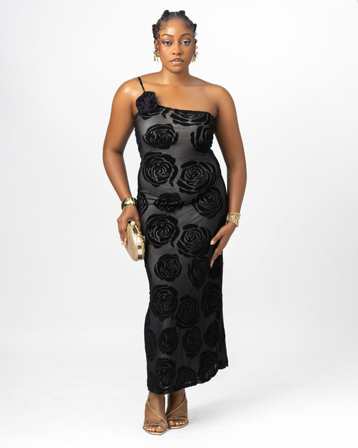 Step into sophistication with this stunning black one-shoulder maxi dress, designed to make a dramatic statement. Crafted from a luxurious sheer mesh fabric, the dress features a striking velvet burnout pattern of oversized roses that create a rich, tactile feel. A delicate one-shoulder strap is accented with a romantic, three-dimensional rose appliqué, adding an extra touch of elegance. The body-hugging silhouette gracefully flows to a floor-length hem, making it an ideal choice for formal events, parties, or special occasions where you want to turn heads.