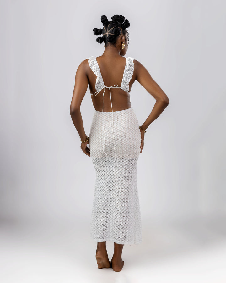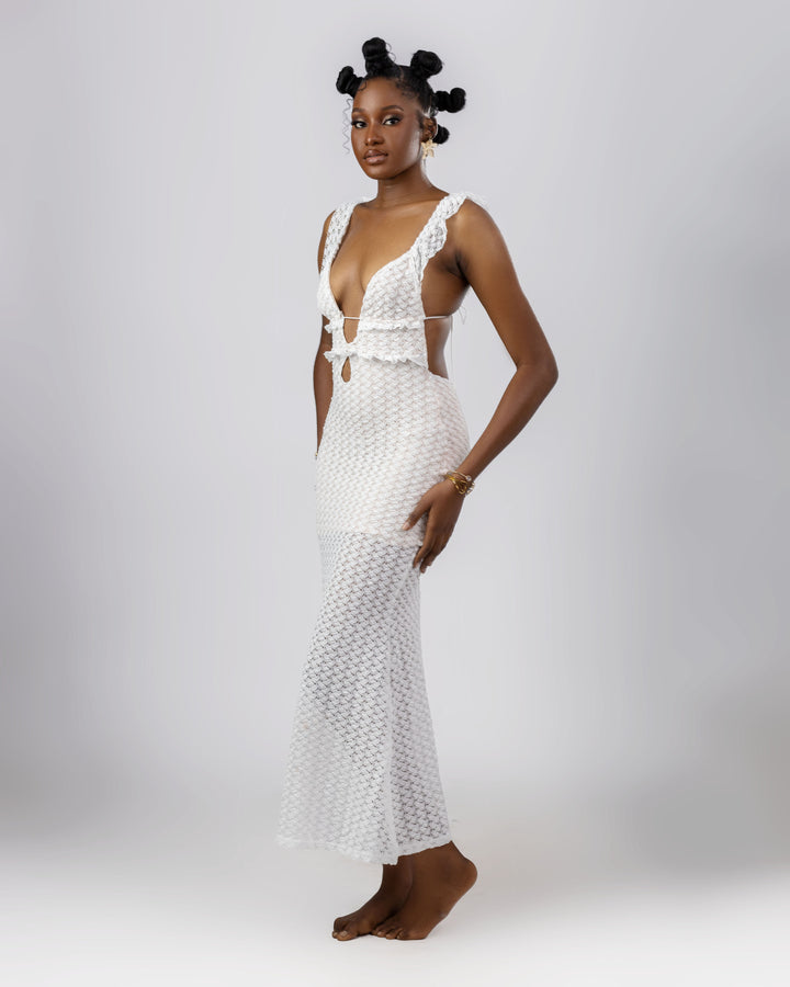 Embrace bohemian elegance with this stunning white maxi dress. The dress is crafted from a delicate, see-through crochet-knit fabric, offering a lightweight and airy feel perfect for warm weather. It features a plunging V-neckline and ruffled shoulder straps that extend to a lace-up back, allowing for a customizable fit. Side cutouts and a fitted silhouette accentuate the waist and hips, while the sheer, floor-length skirt provides a touch of playful romance. This dress is an ideal choice for a beach vacation, a special summer party, or as a chic cover-up.